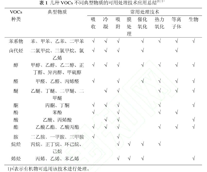 VOCs氣體處理技術(shù)主要分為兩類:回收和消除。表1選擇具有代表性的多種處理技術(shù)在多種VOCs中的應(yīng)用情況進(jìn)行歸納。