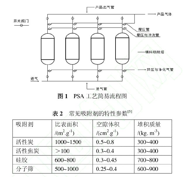 新型變壓吸附(PressureSwingAdsorption,PSA)技術(shù)在國外運(yùn)行比較成熟,該工藝一般在氣體壓力為0.1~2.5MPa之間運(yùn)行,但有些含氣源無需二次加壓。李立清等采用PSA技術(shù)對單相氣體污染物(甲烷、氯氟烴、苯)進(jìn)行回收,其處理回收率能達(dá)到99%,該研究成果可為PSA的工程運(yùn)行提供參考。日本Bell公司運(yùn)用PSA技術(shù)分離乙醇-水體系,將分壓為44676Pa和1679Pa的水與乙醇雙組分與混合氣輸入活性炭吸附床,在加壓/常溫條件下進(jìn)行吸附。經(jīng)第一次減壓進(jìn)行脫附富水蒸氣處理,再經(jīng)第二次減壓進(jìn)行脫附高純度乙醇蒸氣處理,最終將第二次解吸氣體冷卻至-20℃,即可回收98%乙醇產(chǎn)品,將該方技術(shù)運(yùn)用至酒精發(fā)酵凈化濃縮傳統(tǒng)工藝中,可使能耗減少50%。深入研究及開發(fā)新型吸附劑是PSA技術(shù)的重點(diǎn),圖1為PSA工藝簡易流程圖。常見的吸附材料特性如表所示,其中新型材料(沸石分子篩吸附劑)因其高吸附性、無污染性而在國際上越來越受青睞。WeiL等使用粉煤灰合成高效沸石分子篩。在投加10mol/LNaOH、結(jié)晶溫度140℃及結(jié)晶時(shí)間8h條件下,所合成沸石分子篩的Si/Al比為7.9,對苯氣體的吸附率高達(dá)66.51%。在沸石合成中,堿度、Si/Al比、時(shí)間和溫度的增加將影響苯氣的吸附效果。Mukerjee等[7]將煤基活性炭吸附劑浸漬在KI3里,在全碘吸附容器LX-100中,探究正常和限制操作溫度下甲基碘的去污因素。結(jié)果表明,吸附處理后碘殘留量小于0.5μgml-1,煤基活性炭去除穩(wěn)定碘的去污因子大于1000。