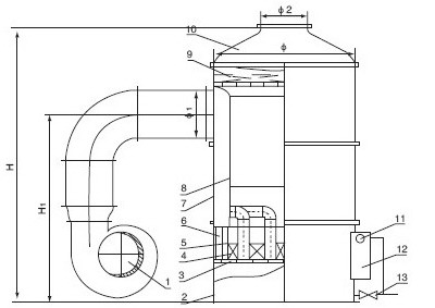 廢氣由風(fēng)機壓入凈化塔勻壓室,首先進入填料段進行充分氣液混合中和反應(yīng),通過多級填料,噴淋,噴霧處理,使氣液兩相充分逆向接觸發(fā)生中和吸收反應(yīng),最后進入脫液處理后排入大氣,經(jīng)處理后的氣體達到國家排放標(biāo)準(zhǔn)。